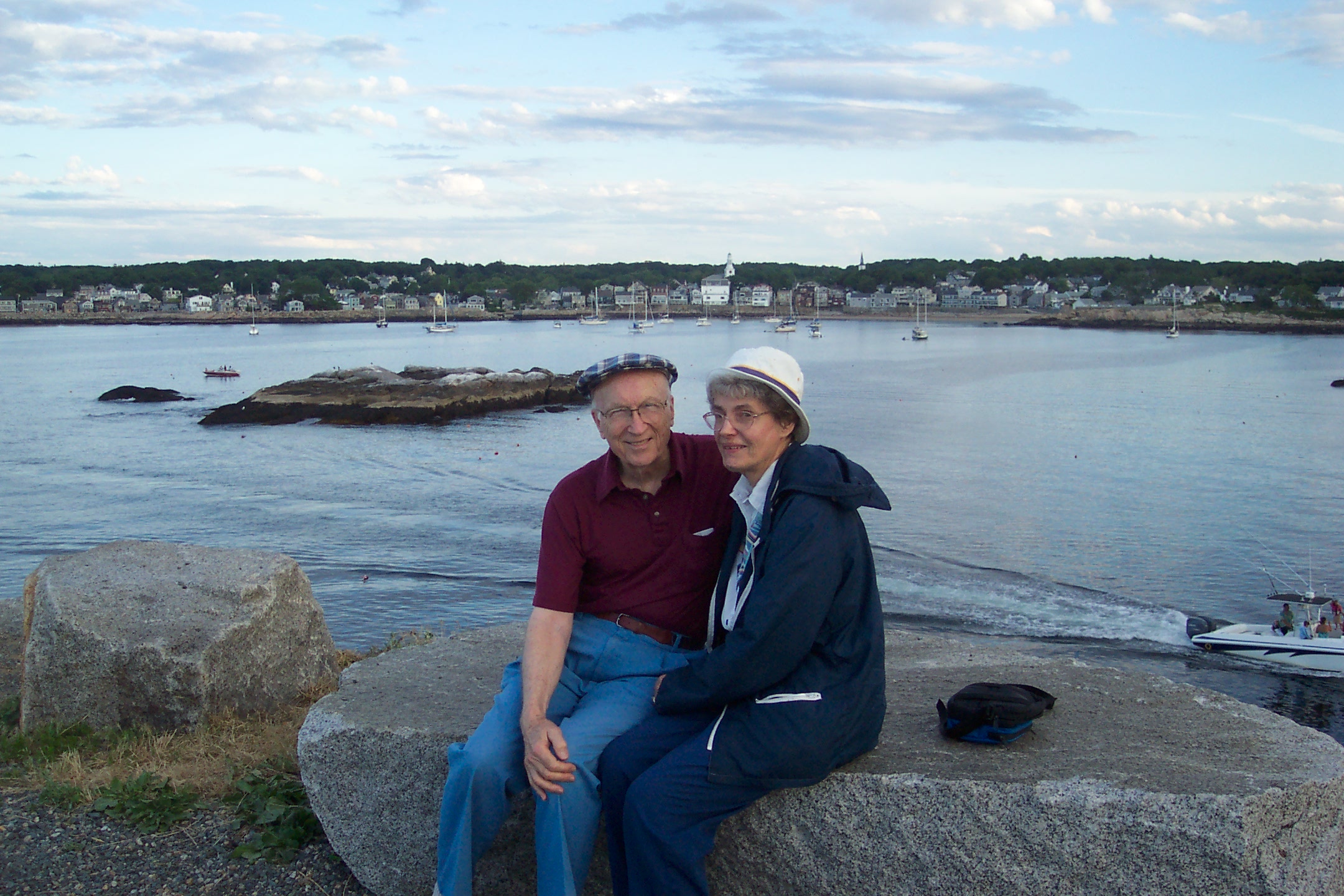 Another fun memory: As many of you may know, Pat & Sandy enjoyed coming out here to Massachusetts to spend time by the sea, on Cape Cod. One their favorite restaurants was called The Lobster Claw. We had a tradition that our first and last dinners during our vacation week would be at “the Claw”. We would get there so we could enjoy the Early Bird Special, which included a cup of their amazing clam chowder and ice cream dessert. Sandy always ordered the Bluefish and a baked potato, and I have fond memories of watching him and Pat thoroughly enjoying their fresh seafood. Our dinner was always followed by a walk along our favorite Nauset Beach. They would put on their jackets, and happily sit on one of the benches, watching Andy and Ailsa walk in the surf.